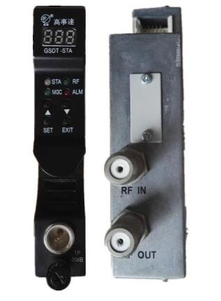 GSDT-AMP為頭端或分前端正向射頻放大模塊,運用射頻放大電路可提供高線性、低噪聲和低失真的特性。通過前面板控制,可以調(diào)節(jié)輸出射頻信號,從而得到信號的輸出電平值。由于纜線的信號損耗,造成高低頻信號不平,可以通過前面板控制輸出斜率,調(diào)平信號。