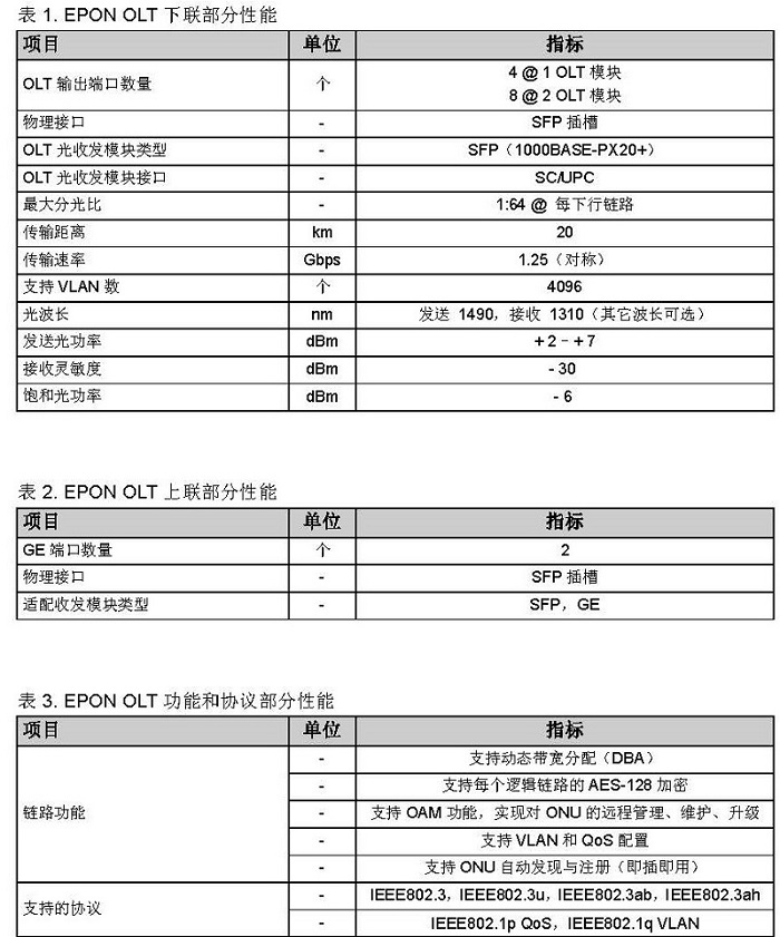 GSDCOH 提供 2 個上聯 GE 端口,4 或 8 個下聯千兆 OLT 端口,1 個 MGMT 本地管 理端口, 1 個 console 故障診斷端口, 1 個 RS-232 串口。該 頭端 OLT 的最大分光比為 1:64, 系統(tǒng)最大可支持 256(1 個 OLT 模塊)或 512(2 個 OLT 模塊)個 ONU。